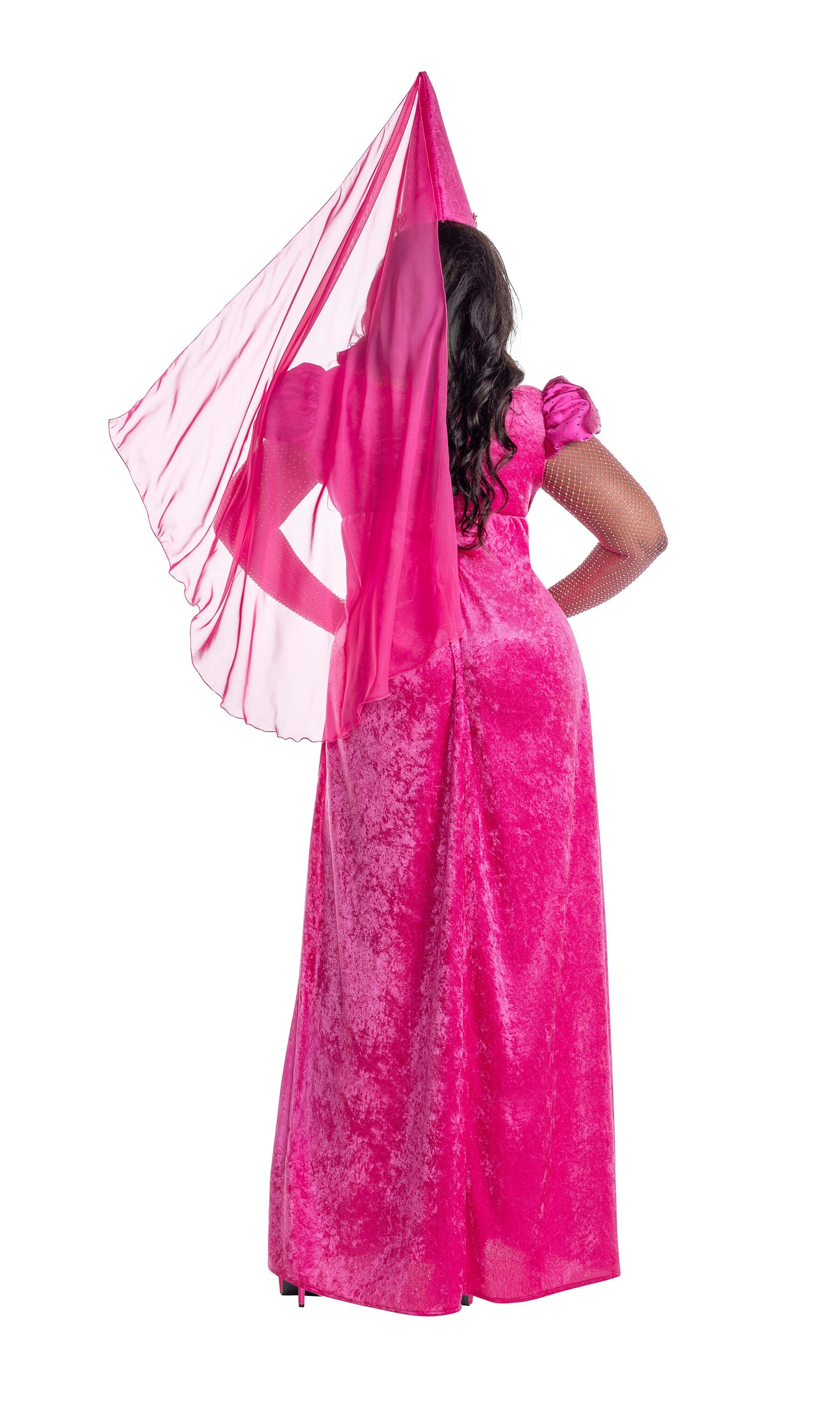 PLUS Medieval Princess extra-high slit velvet empire dress with built-in teddy, sequined embroidery details, diamond fabric accents and diamond fishnet sleeves. Comes with matching hat with chiffon veil.
